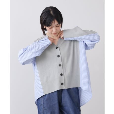 ニットと布帛を組み合わせた切替デザインが目を惹く、表情豊かなカーディガン。フロントはすっきりとしたVネック、バックスタイルにかけて広がるシルエットで、さりげなく体型カバーも叶えます。程よいゆとりがありながらも落ち感があるため、羽織るだけでこなれた印象に。シンプルなコーデにプラスするだけで、春らしいトレンド感を演出できる一枚です。
