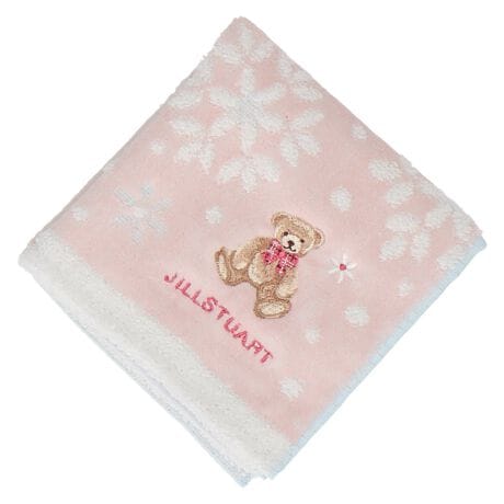フラワーデザインとベアの刺繍の組み合わせが可愛らしいタオルハンカチ。プレゼントにもおすすめな一枚です。
