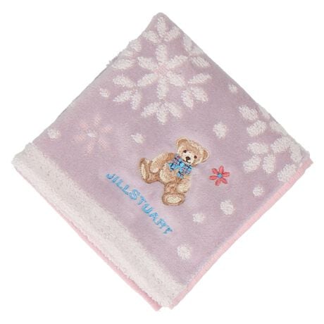 フラワーデザインとベアの刺繍の組み合わせが可愛らしいタオルハンカチ。プレゼントにもおすすめな一枚です。