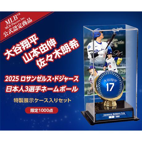 3選手の名前と背番号が、栄光のドジャーブルーにくっきりと浮かび上がるMLB(TM)公式記念ボールと、専用のディスプレーケースのセットです。