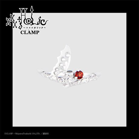 <壱原 侑子>をイメージした蝶とキセルデザインのリングは深紅のガーネットがきらりと輝く妖艶なデザインに。