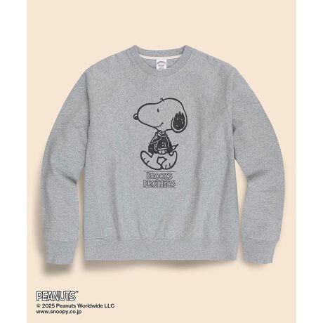 グレーとネイビーの2色展開のクルーネックスウェットシャツは、3ボタン段返りブレザーにガードストライプの蝶ネクタイを身につけたスヌーピーのプリントがポイント。ブランドロゴもPEANUTSのロゴと同じフォントを採用した特別デザインです。大きなプリントながらモノトーンのシルクスクリーンを用いることで、落ち着いた印象に。グレーは掠れた質感で、更にこなれたヴィンテージ感を演出しました。メンズサイズですが、女性の方もオーバーサイズで着用可能なユニセックス仕様です。