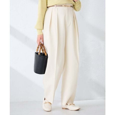 深めにタックの入ったワイドテーパードパンツ。