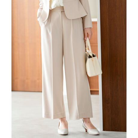 ・エレガントに穿けるスッキリワイドパンツ・きれいな腰周りと、真っ直ぐすとんと落ちるシルエットで体形や足のラインを拾いにくく、穿きやすいデザイン・後ろフェイクポケットなし、前ベルト部分を持ち出しデザインにアップデート・オケージョンだけでなく、通勤やきれいめコーデにも着回せるシンプルなデザイン・センタープレスにはセンタークリース加工を施し、きれいなプレスラインをキープ・後ろベルトはゴム入りで楽な着心地