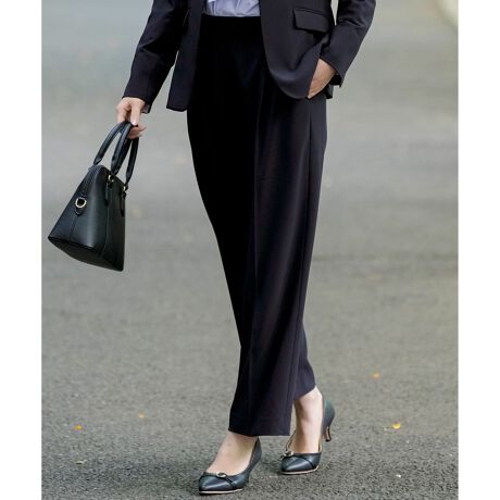 ・エレガントに穿けるスッキリワイドパンツ・きれいな腰周りと、真っ直ぐすとんと落ちるシルエットで体形や足のラインを拾いにくく、穿きやすいデザイン・後ろフェイクポケットなし、前ベルト部分を持ち出しデザインにアップデート・オケージョンだけでなく、通勤やきれいめコーデにも着回せるシンプルなデザイン・センタープレスにはセンタークリース加工を施し、きれいなプレスラインをキープ・後ろベルトはゴム入りで楽な着心地