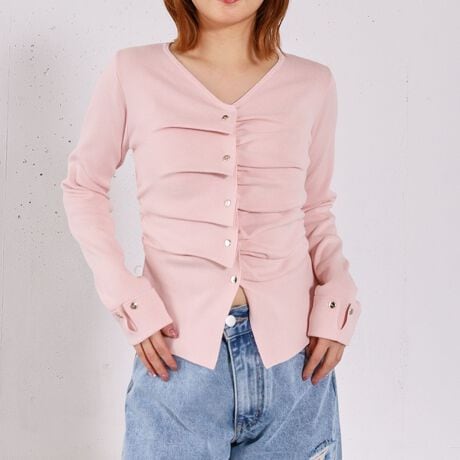 ・フロントのタック×ボタンデザインが、シンプルながらも着映えする一枚