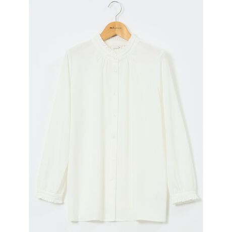 ストレッチ バンドカラーフリル 長袖ブラウス
