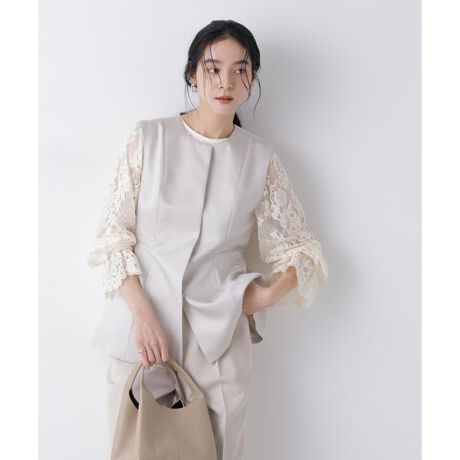 光沢感のある糸を使用したオリジナルジャガード素材で仕上げたジレ。ウエストを程よくシェイプしつつ、裾に向かってふんわりと広がる女性らしいペプラムシルエットが魅力。アクセサリーを加えればパーティシーンまで対応できる、幅広く活躍するアイテムです。