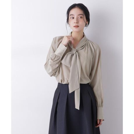 さりげないドビードット柄をあしらったリボンタイブラウス。衿ぐりと袖口にはたっぷりとギャザーをとり女性らしいデザインに。オケージョンからデイリーまでONOFFで活躍します。