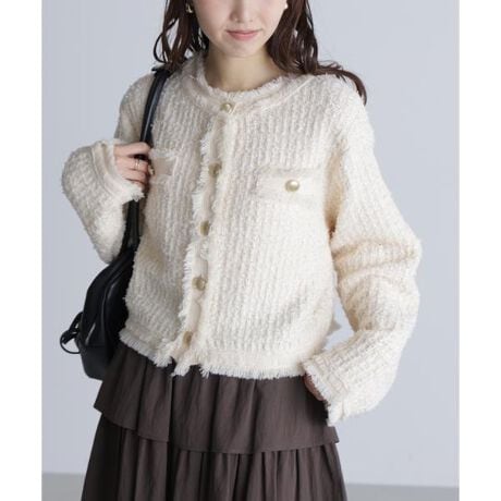 リボンテープがちらちら見える可愛い編地のニットツイードカーディガン。度目を詰めた編地は肉厚で、ジャケットのようなしっかり感があります。襟ぐり、前立て、裾、袖口、ポケットは総針編みにしており、ダレることなく着ていただけます。また、総針編みからフリンジを出した高見えディテールも拘り。今季トレンドの金色ボタンもポイントです。一枚でも羽織りにも使えます。デイリー使いからセレモニーシーンまで活躍してくれます。※モデルの着用画像の場合、光の当たり具合により、実際の色味と異なって見えることがございます。色味は、商品単体の画像をご参照ください。