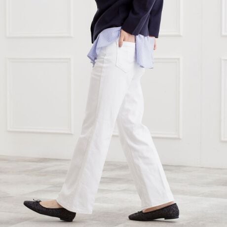 控えめフレアーが美脚をつくるデニムパンツ。