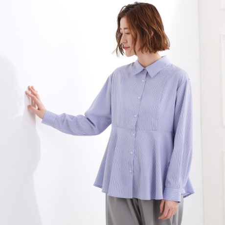 裾のフレアをギャザーではなくフレア展開で仕立てた、華やかなペプラムシルエットのシャツです。