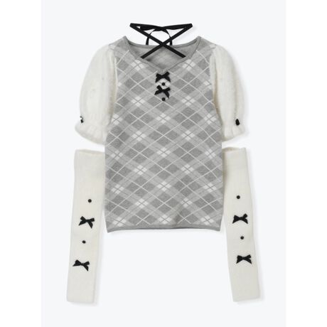 クラシカルなチェック柄ニットに、ふわふわのフェザー袖をドッキングした存在感たっぷりのトップス。