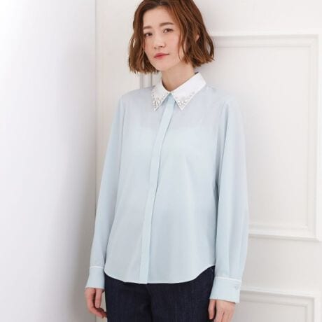 落ち感のあるとろみ素材を使用した、上品な印象のビジューカラーシャツ。