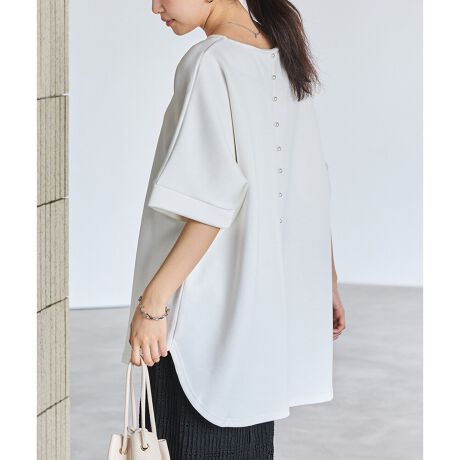 袖丈は長めにすることでさりげなく二の腕をカバー、裾はラウンドヘムのデザインと後ろタックで抜け感を演出。ヒップ周りが隠れる着丈なので体型カバー効果も期待できます。伸縮性のあるポンチ生地を使用した、楽な着心地ながらキレイ見えする1枚です。