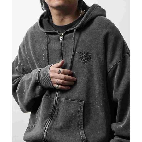 ILL'S トライバルハート刺繍 フルジップパーカー グランジ加工×スプラッシュ加工 フーディ