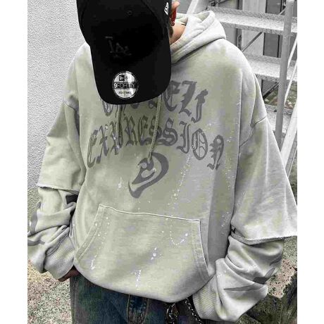 ヴィンテージ風配色とグランジグラフィックが魅力のフェイクレイヤードパーカー。
