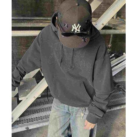ヴィンテージ風配色とグランジグラフィックが魅力のフェイクレイヤードパーカー。