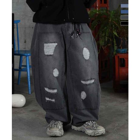 バレルレッグシルエットとダメージ加工が特徴のダブルニーデニム