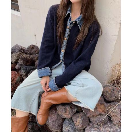 デニム切り替えニットカーディガン 韓国風