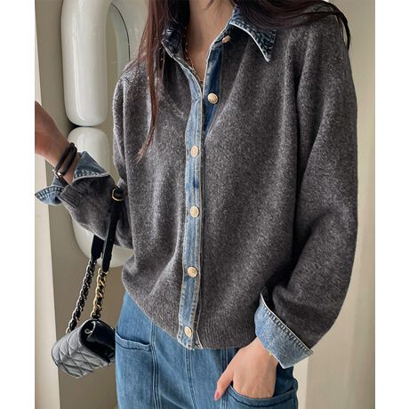 デニムとニットの異素材切替がかわいいゴールドボタンカーディガン。