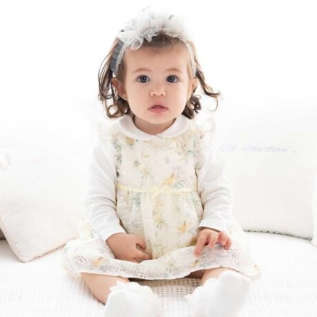 オーガンジー花柄とフリル袖の華やかワンピースと同色ブルマの女の子ベビー用2点セット。
