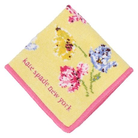 両面に同じ柄が表現され、毛羽立った生地が柔らかく丈夫で吸水性も良い高級感溢れるシェニール織りハンカチです。ケイト・スペードらしいシックで愛らしいフラワーのデザインです。