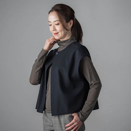 前後どちらでも着用できる2way仕様のクロップドジレ。