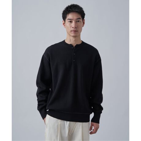 表裏の配色が特徴の、スウェットライクヘンリーネックニット。