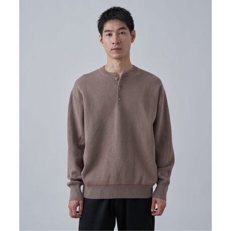 表裏の配色が特徴の、スウェットライクヘンリーネックニット。