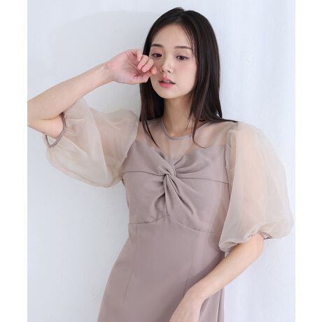 柔らかく膨らむオーガンジーのパフスリーブが、視線を自然に上へと誘導しスタイルアップを叶えます。