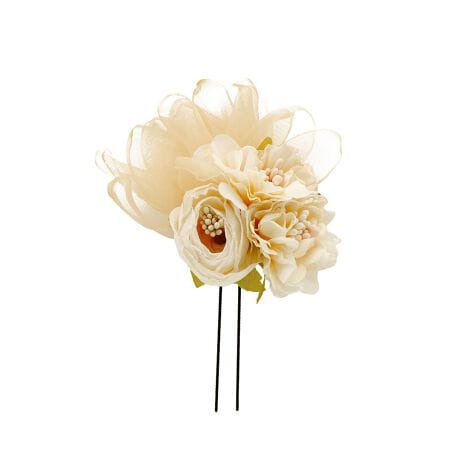 ドライフラワー調の花に透け感のあるオーガンジーの花びらが添えられた大人可愛いデザインです。