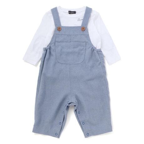 カラーは白のTシャツにくすみブルーのオーバーオール(ブルー)と、イエローのTシャツにライトブラウンのオーバーオール(ブラウン)の2色展開。