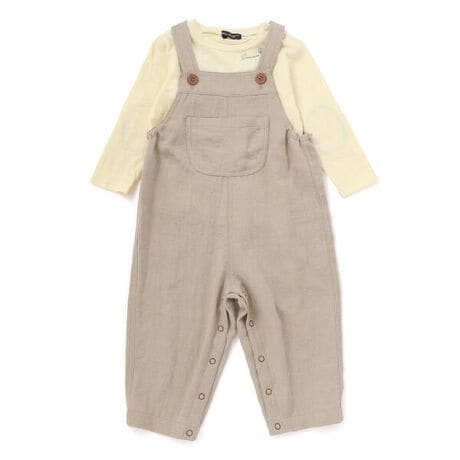 スラブガーゼ素材の落ち着いた発色のオーバーオールはナチュラルかわいいアイテム。