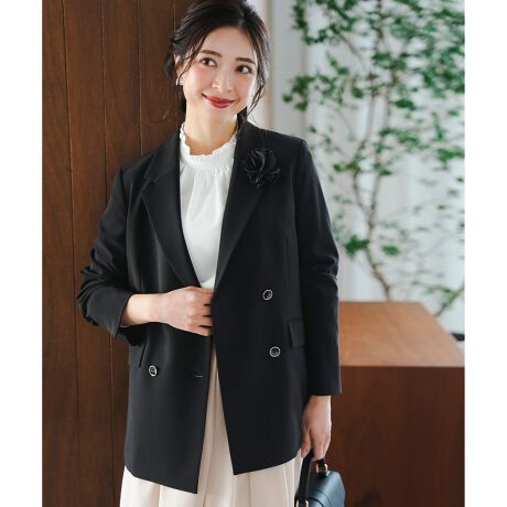 ・セレモニーダブルクロスシリーズで初のW前ジャケット・オケージョンに無理なく取り入れられるデザイン・きちんと感がありつつ、自然なトレンド感をプラス・おしりが隠れる着丈で気になる部分をカバー・ほどよいゆとりがありつつも吸いつくような着心地・ほんのりシェイプされた女性らしいシルエット・アクセントになる上品な金縁ボタン