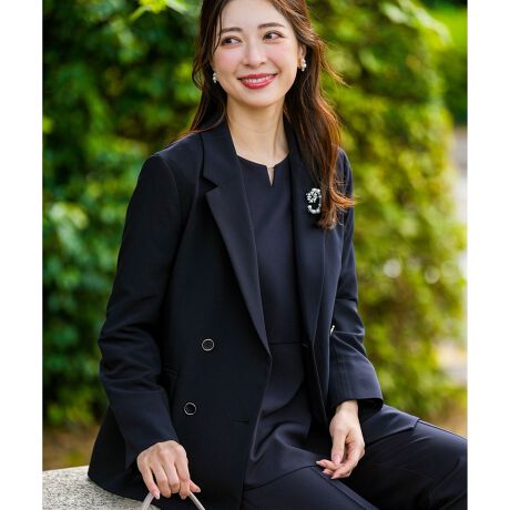・セレモニーダブルクロスシリーズで初のW前ジャケット・オケージョンに無理なく取り入れられるデザイン・きちんと感がありつつ、自然なトレンド感をプラス・おしりが隠れる着丈で気になる部分をカバー・ほどよいゆとりがありつつも吸いつくような着心地・ほんのりシェイプされた女性らしいシルエット・アクセントになる上品な金縁ボタン