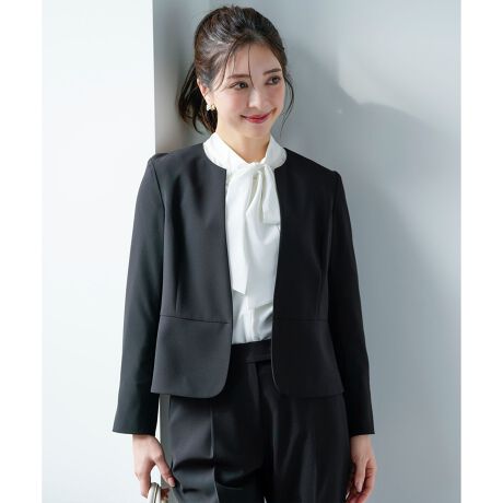 ・クルーカラーがフェミニンな印象のボレロジャケット・コンパクトな着丈とペプラム切り替えでスタイルアップ見えするデザイン・ペプラムデザインが腰周りを自然にカバー・昨年よりもバストと袖周りにゆとりをもたせ、着心地と動きやすさをアップデート・身頃の前丈を少しプラスし、着用時に前が上がってしまうのを改善・ホックで前を留められるので、かしこまったシーンでも安心してお使いいただけるデザイン