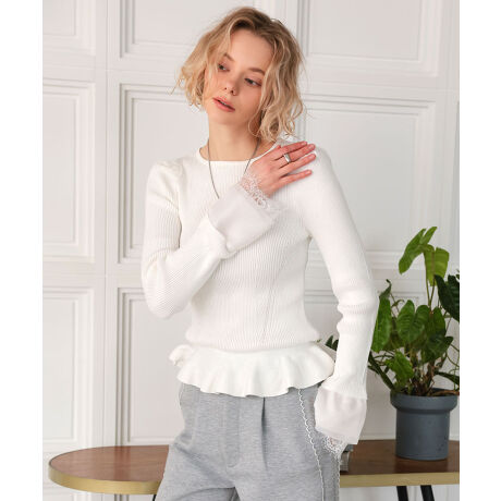 デザイン性のあるパフスリーブ袖口にレースがドッキングされたニット。