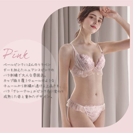カップにはラメ糸を使用した透け感のある大花刺繍レースを使用。サイドにあしらったドレープが優しくバストを引き上げ、シルエットを美しく演出。さらにアンダー部分のストレッチレースフリルが可憐さを添え、どこか儚さを感じさせるデザイン。