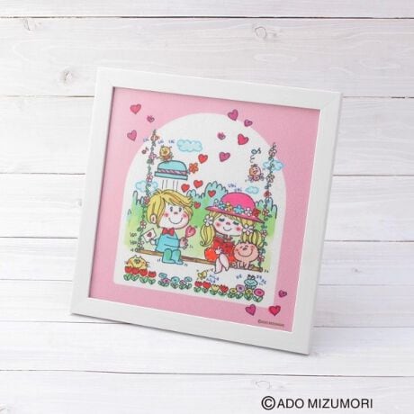 [型番:41075559]【デザイン】水森亜土イラストの額装です。凹凸感のあるちりめん素材でできており、紐・スタンド付きなので、お好きなところに飾っていただけます。※照明の関係により、実際よりも色味が違って見える場合があります。また、パソコン・スマートフォンなどの環境により、若干製品と画像のカラーが異なる場合もございます。