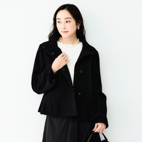 開けても閉めても異なる印象が楽しめる、スタンドカラーが特徴的なショートコート。