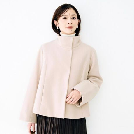 開けても閉めても異なる印象が楽しめる、スタンドカラーが特徴的なショートコート。