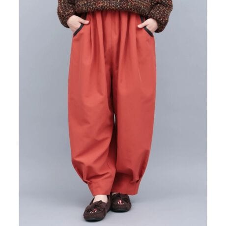 フロントに入れたタックで腰回りにゆとりを持たせつつ、裾に向かって自然にすぼまる丸みのある「たまご型シルエット」が特徴です。