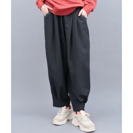 フロントに入れたタックで腰回りにゆとりを持たせつつ、裾に向かって自然にすぼまる丸みのある「たまご型シルエット」が特徴です。