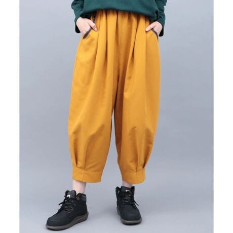 フロントに入れたタックで腰回りにゆとりを持たせつつ、裾に向かって自然にすぼまる丸みのある「たまご型シルエット」が特徴です。
