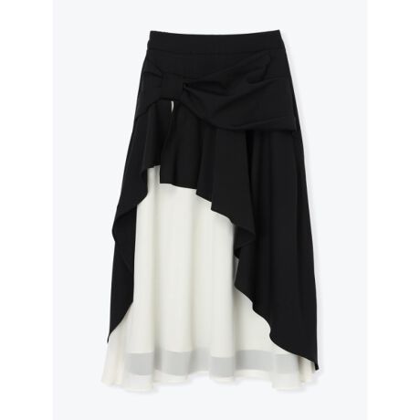 [型番:25550724767]ウエストのリボンモチーフがさりげないアクセントになるロングスカート。縦のラインを意識したシルエットで、甘さを抑えつつ大人っぽく仕上げました。広がりすぎないフレア感で、トップスを選ばずバランス良く着用可能。ブラウスで上品に、ニットやスウェットでカジュアルダウンも楽しめる、着回し力の高い一枚です。