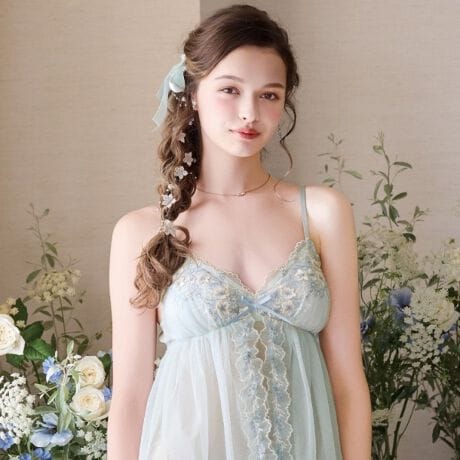 クレマチスの可憐な花々をモチーフに、小花や茎などを繊細なラメ糸で表現したシリーズです。パッカー手法でふっくらと咲かせた大輪のクレマチスは、キラキラとしたラメ糸をあしらい、動くたびにさりげなくきらめく上品なデザインに仕上がりました。身生地は透け感を楽しめるソフトチュール素材で、長さの異なるチュールを2枚重ねることで、女の子らしいフレアシルエットが完成。縦にあしらわれたギャザーたっぷりのチュールレースは、軽やかでキュートな印象をプラスします。毎日を特別な気分にしてくれるような、清楚で可愛らしいコレクションです。