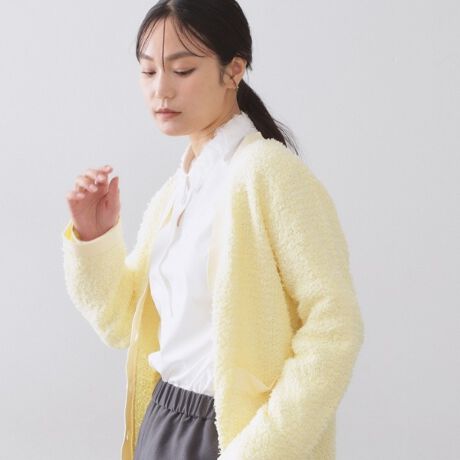 ・襟にチュールを縫い付けた他にはないデザインで、顔周りにさりげなく華やぎをプラス。