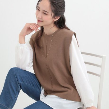 ニットベストはクルーネックネックデザインと裾に入ったスリットがこなれ感を演出します。