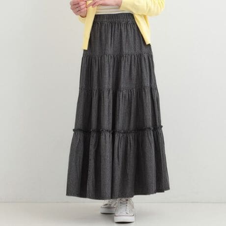 軽やかな女性らしさを演出するティアードデニムロングスカート